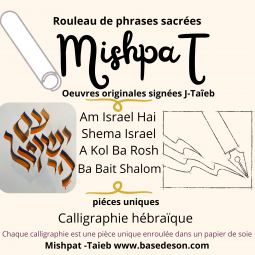 La calligraphie à la plume des lettres hébraïques apportent à la phrase une vibration d' énergie en relation avec le sens de la Mishpate.